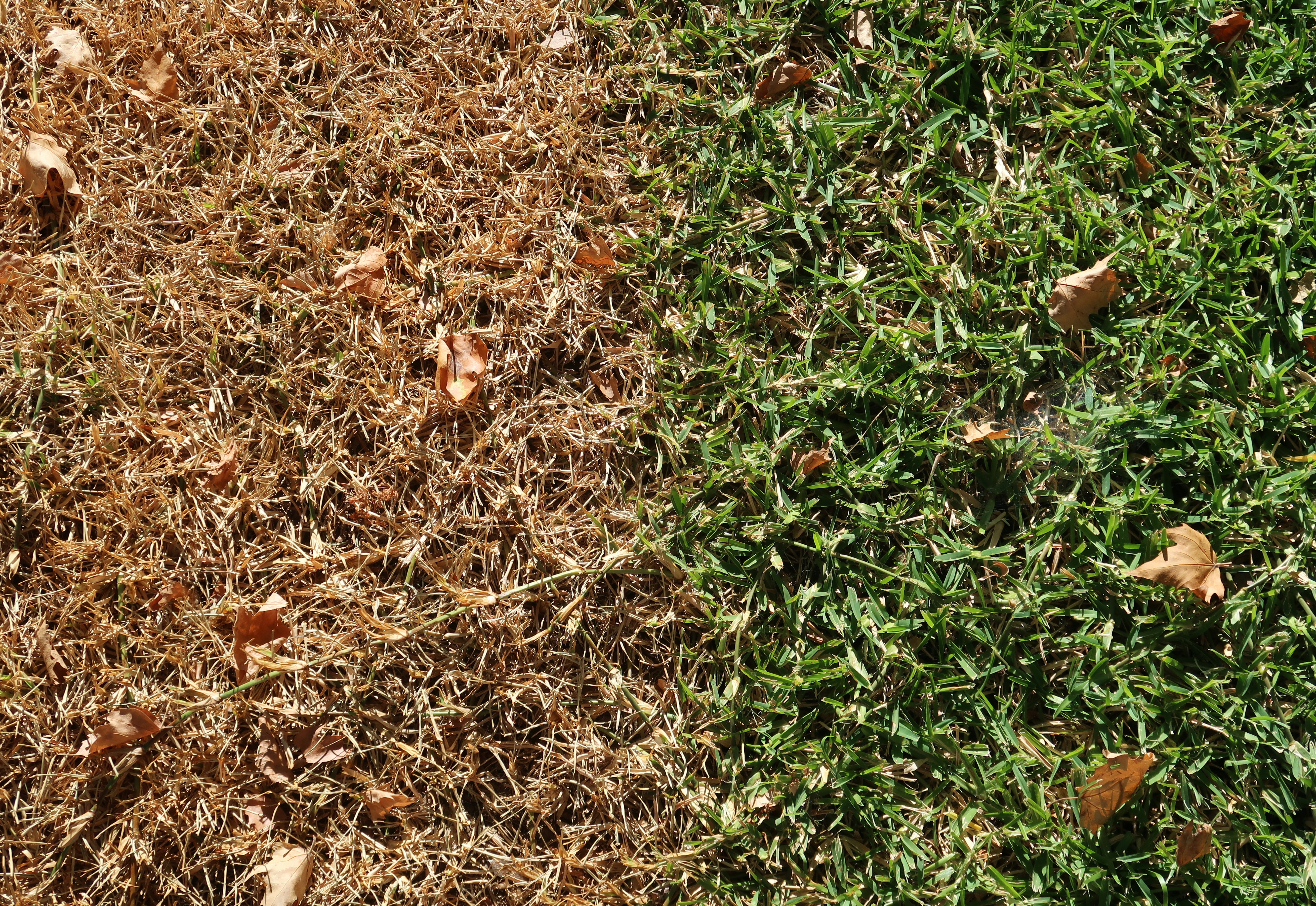 Yellow grass and green grass at the property line. 2025-07-06