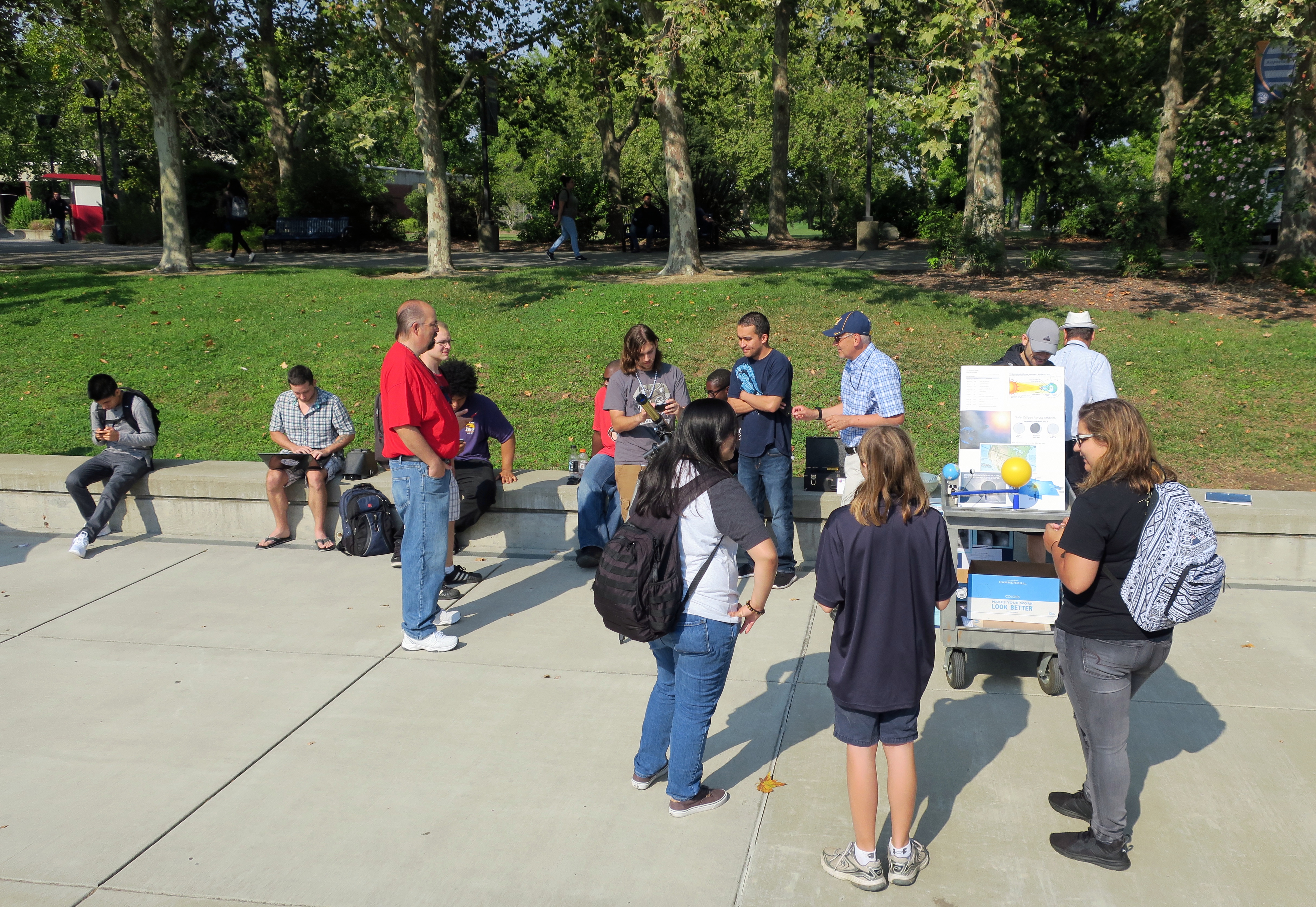 Solar eclipse gathering by the fountain. 2017-08-21